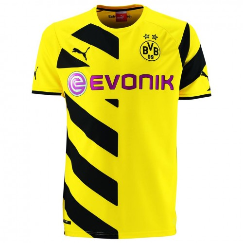 The yellow and black Borussia Dortmund 14/15 PUMA home jersey features a diagonal stripes on half of its front and one sleeve. Two starts appear on the chest of above the BVB emblem in recognition of the twenty of the club’s titles.