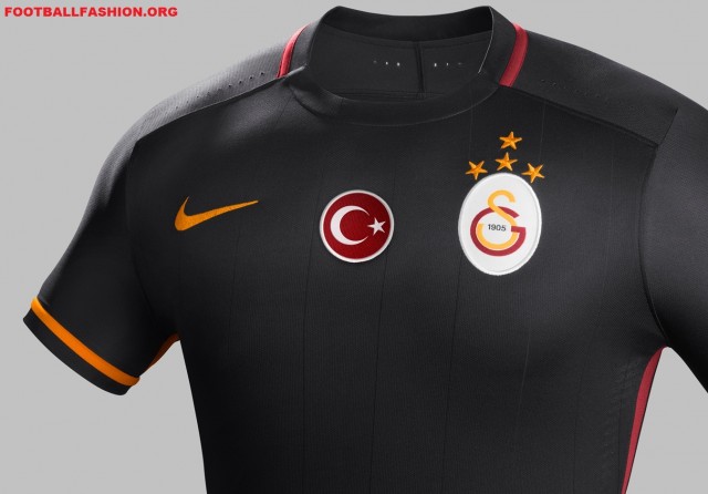 The away kit is black with red and yellow stripes, reminiscent of the home kit color blocking, along the flanks. It uses the same new Nike round neck design as the Galatasaray 15/16 home kit with a series of subtle pinstripes added in.