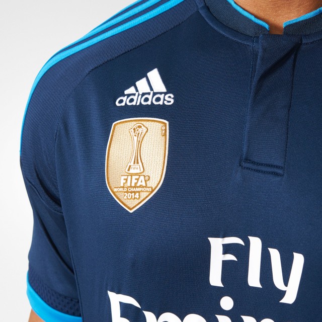 The Real Madrid 2015/16 third jersey uses a new, relatively restrained adidas design featuring a ribbed Henley collar. Mesh ventilation inserts applied above the sleeve cuffs and waistline. The shirt comes in standard and FIFA World Club Cup champions versions. The latter has the official golden FIFA World Champions badge on its right front.