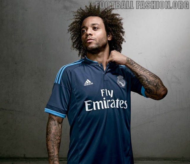 Los Blancos new change kit has a dark blue base with a bright shade of blue used for its collar trim, sleeve cuffs and adidas branding. The Real Madrid crest on the shirt uses a thermosealed navy blue and white colorway. The shirt is inspired by the night matches played at the legendary Bernabéu.