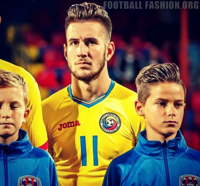The primary jersey is in the traditional yellow of the Romanian national team. It has a blue, modern v-neck collar that is trimmed with the colors of the Romania national flag at its front. Red is used for the shirt’s side striping, sleeve cuffs and armpits.