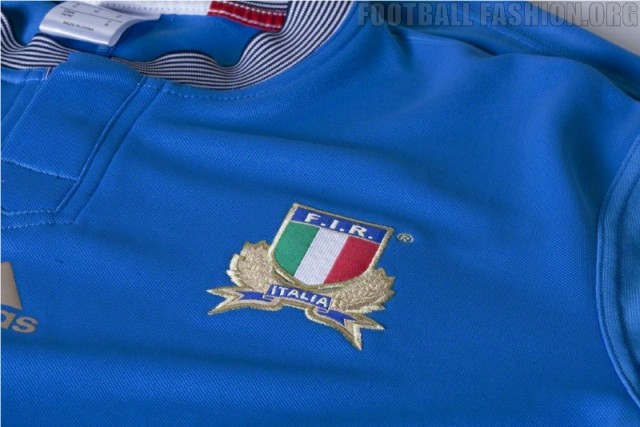 Italy’s RWC 2015 primary jersey (available now at World Rugby Shop, Kitbag Rugbyand Lovell Rugby) is in the customary home blue of all of the Federazione Italiana Rugby (FIR) national teams. It has a very distinctive henley collar that features a series of dark blue stripes on a white base. The upper hack of the jersey also has a series of stripes built into its fabric.
