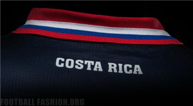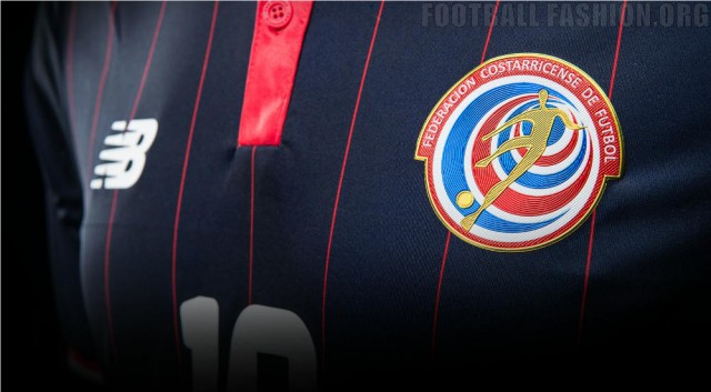 Los Ticos new change jersey has a dark blue base with a series of red pinstripes. It uses the same classic football shirt, polo collared design as the Costa Rica 15/16 NB home and away kits released in May and worn at this summers CONCACAF Gold Cup 2015.