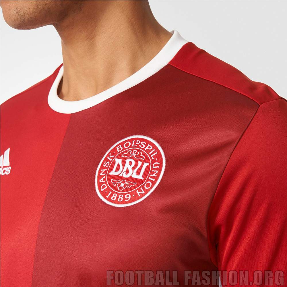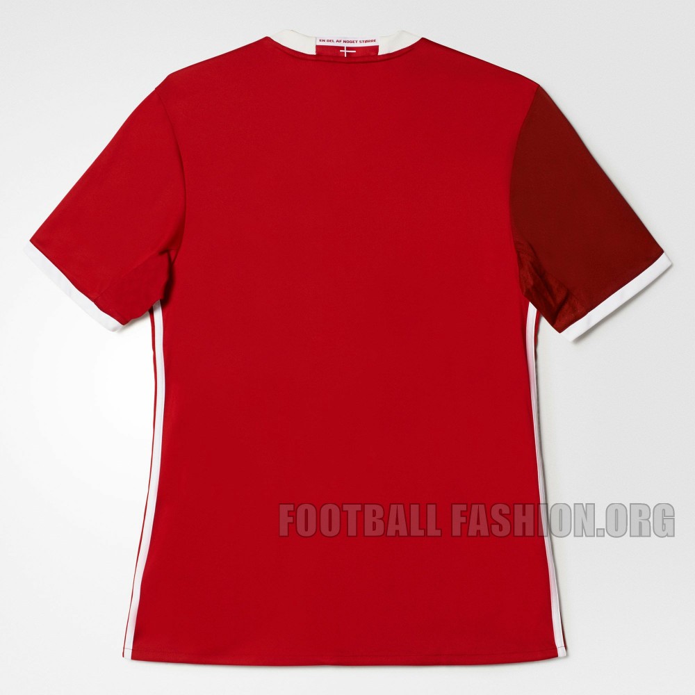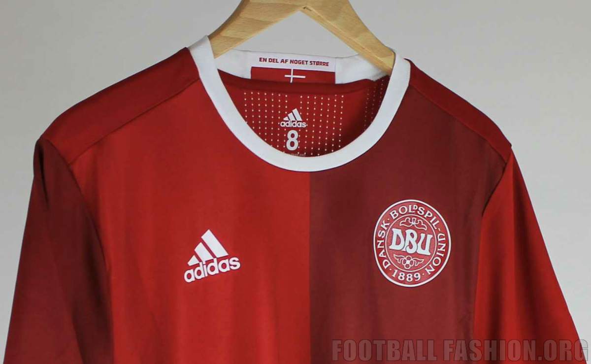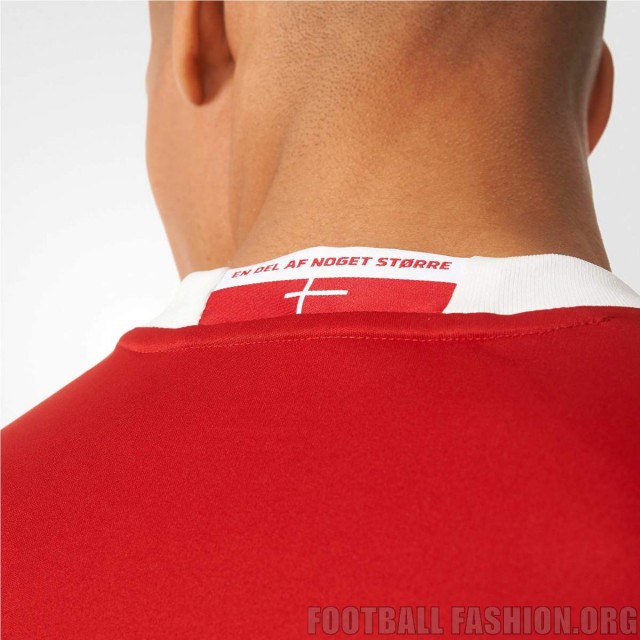The crewneck collar of the Denmark 2016/17 adidas home jersey has the text “En del af noget større” (A part of something bigger) and a stylized Danish flag on its rear inside and outside areas.