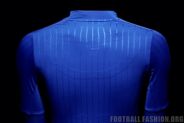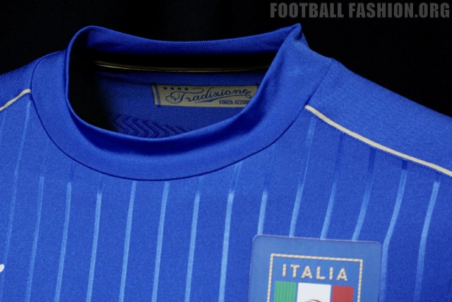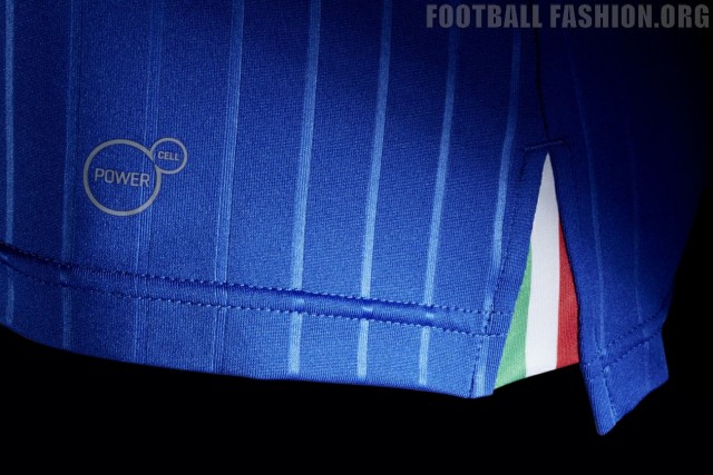Thin embossed vertical stripes along the front, sleeves and back draw back to the traditional pinstripe detail of Italian fashion. Additional design elements include form stripe mesh inserts along the shoulders, high sleeve cuffs, golden sleeve piping and the side vent ‘tricolore’ flag detail on the left and right of the hem. The blue home shirt is combined with traditional white shorts and blue socks that also feature subtle golden details.