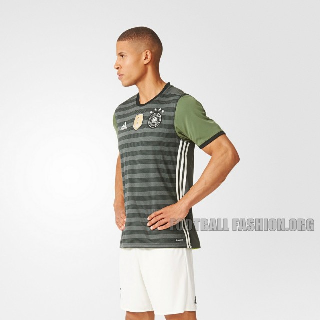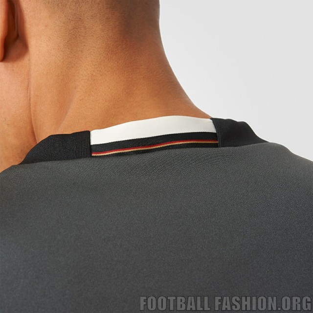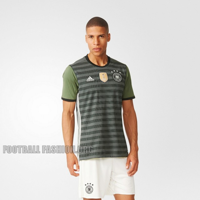 The colors of the away shirt encompasses the different elements of German football: grey representing the concrete playgrounds and arenas where street footballers, the green reflecting the grass pitches on a Sunday morning and the beige reminiscent of the cinder pitches were local legends have been born.