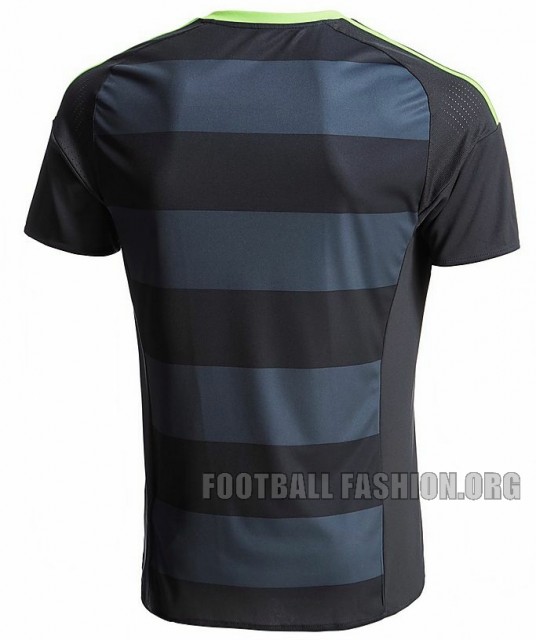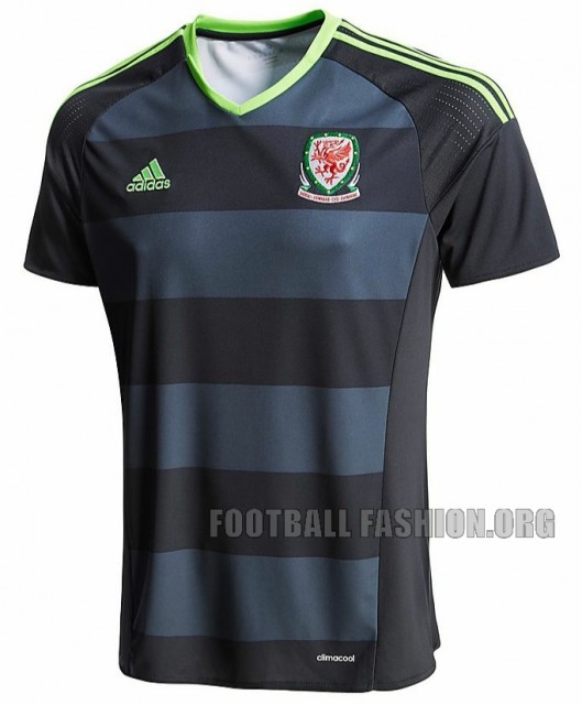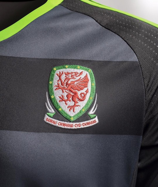 The away jersey that will be worn by Real Madrid star Gareth Bale and the rest of The Dragons in France next summer has a charcoal base. A series of dark gray stripes on its front produce a hooped effect while bright yellow is used for the adidas shoulder stripes, collar and logo on the shirt. The Wales EURO 2016 adidas away kit is completed by charcoal shorts and socks.