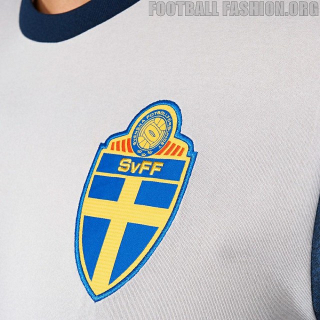 The Svenska Fotbollförbundet (SvFF) crest is embroidered on the left breast while the Sweden national flag appears on the left sleeve. The middle inside and outside rear collar area of the new Swedish alternate jersey is in the Scandinavian country’s blue and yellow. “SVERIGE” (Sweden) is printed on the outside back collar.