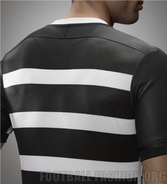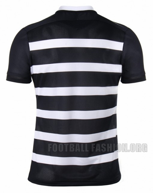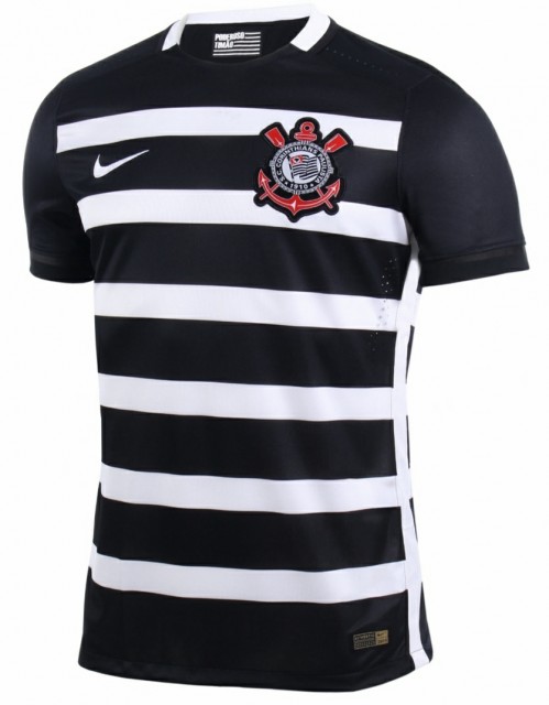 The Corinthians 2016 Nike away kit uses a crewneck design. It has a black based with six white horizontal stripes that running along its front and back. “Poderoso Timão” (Mighty Timão) appears on a background of black and white stripes on the inside neck area. White shorts and black socks complete the new kit.