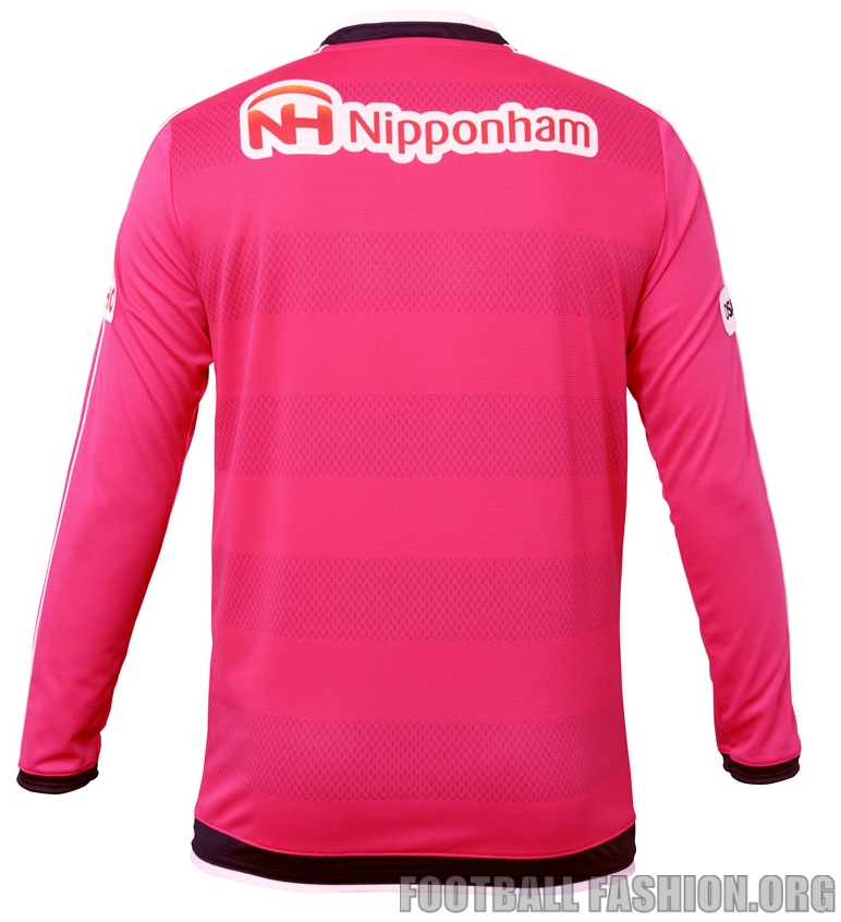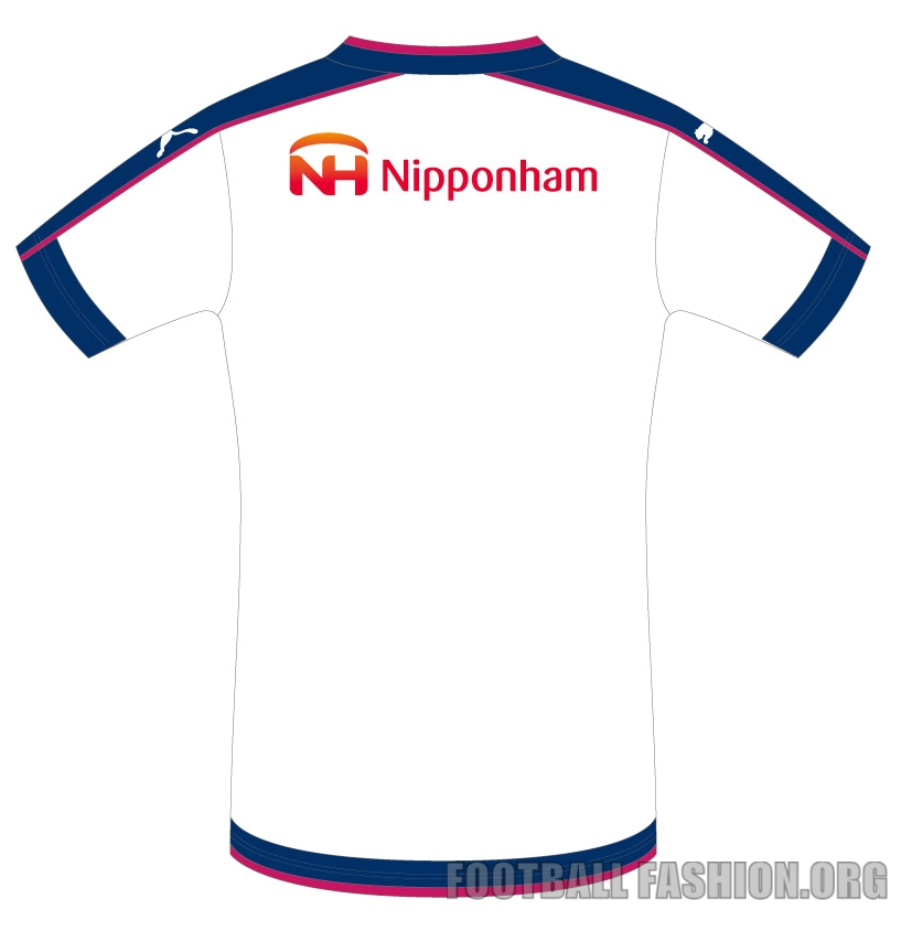 Cerezo Osaka’s 2016 PUMA away kit uses the same template as the home kit. Dark blue and pink on it s shoulder stripes, collar, sleeve cuffs and waistline provide a contrast to the white base of the change shirt.