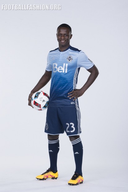 The shirt uses a new adidas design with a modern rounded neckline with a two buttoned placket. adidas’ famed three stripes run along its flanks. Navy blue shorts and socks complete the Whitecaps 2016 secondary kit.