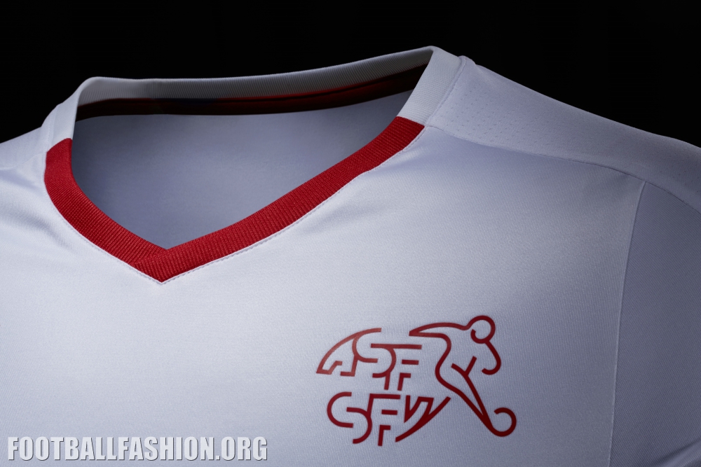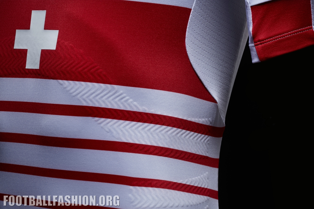 Stepping away from Switzerland’s traditional away designs of previous years, the new kit shows off a new and unique design. The shirt body features a horizontal stripe pattern that starts with the bold red chest band, which has the Swiss white cross placed centrally.