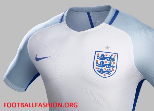 The England 2016/17 Nike home kit features a classic white English body with contrasting light blue shoulders and sleeves produced by cross-dyeing white with the blue used elsewhere in the kit. On the chest, engineered knit zones create a geometric pattern that enhances fit, with smaller mesh shapes at the bottom of the graphic.