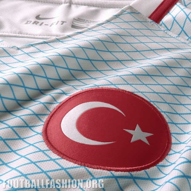 This graphic begins in black at the back hem of the Turkey 20165/17 shirt and transforms into a powerful red as it spreads up towards the shoulders. On the away shirt, the motif changes from bright turquoise to brilliant white. “Turkey” appears on the back collar of both shirts.