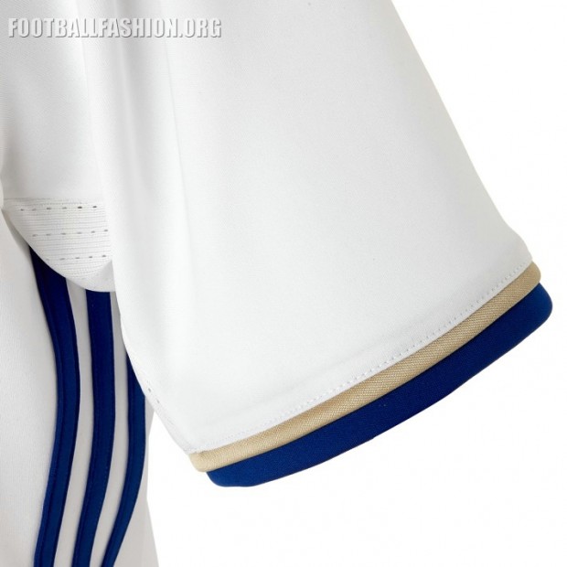 Blue adidas stripes run down the flanks. Blue and gold detail the shirt’s sleeve cuffs and back collar areas.