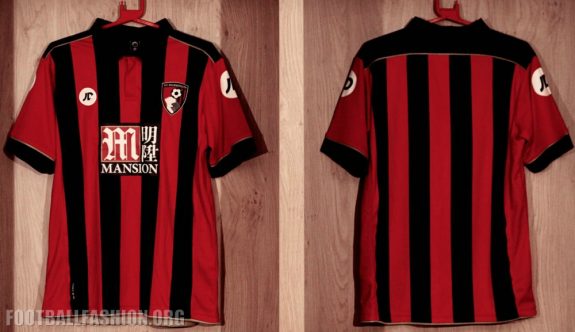 The Bournemouth 2016/17 home shirt continues the club’s tradition of using red and black vertical stripes. It is matched with mainly black shorts and socks.