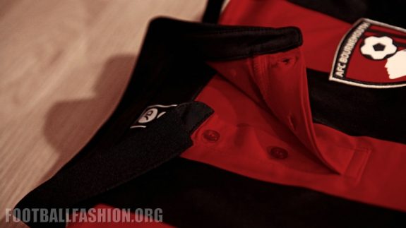 The new jersey is the first AFC Bournemouth kit to feature a polo collar since 2003. The black collar matches with the shirt’s shoulder and upper back areas and sleeve cuffs. The circle-enclosed JD logo appears on the sleeves and right breast.