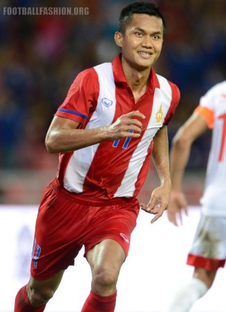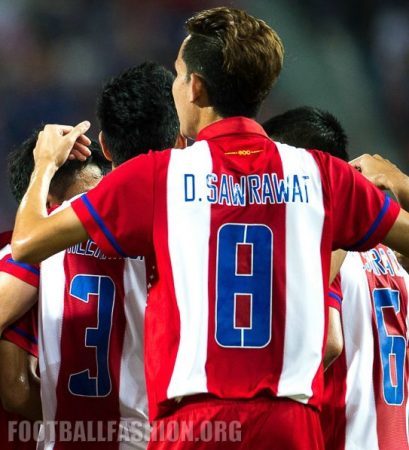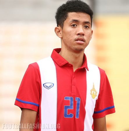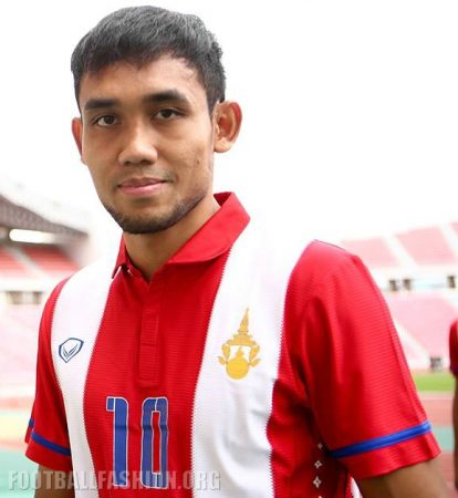 The new shirt has a classic style featuring red and white stripes complemented by a classic polo collar. Bands of blue just above the sleeve cuffs, the Grand Sport branding and player names and numbers are in the blue that is part of the Thai national flag.