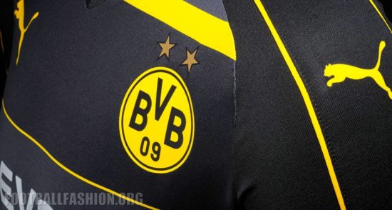 Der BVB will wear a mainly black alternate jersey with yellow detailing next season. The yellow detailing on the shirt includes horizontal stripes of two different widths, piping on the sleeves and shoulders, and inside neck taping.