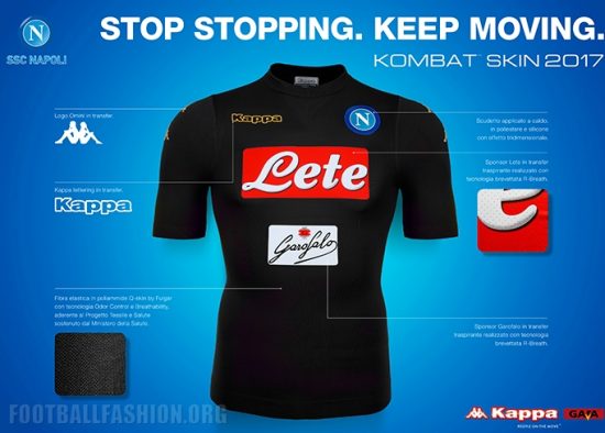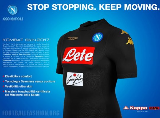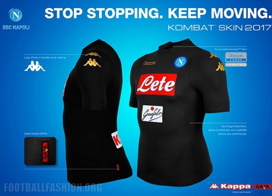 Like the Napoli 2016/17 home shirt, the mainly black kit uses the new rounded neck Kombat Skin 2017 design. The Kappa brand, Omini logos and player names and numbers on the jersey are all in gold. A pair of sponsor logos appear on the front of the shirt and one on its back. Only the logo of main shirt sponsor Lete will use used for UEFA Champions League editions of the kit because of competition regulations.