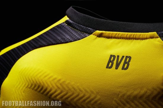 The shirt has a rounded collar with a split opening at its front. Its black accenting on its front and back shoulders and waistline include a carbon fiber effect. “BVB” is printed on its signoff area while “DORTMUND” is emblazoned across its lower back.