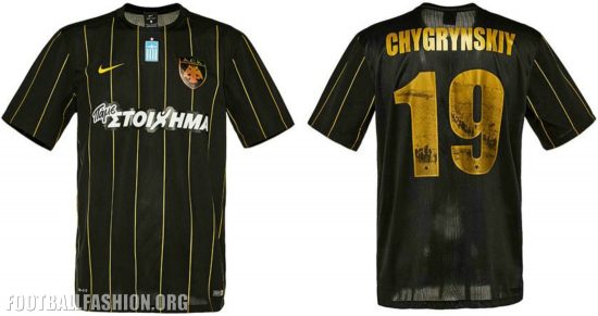 AEK have departed from their traditional home look of yellow and black stripes in favor of a mainly black primary kit for the 16/17 season. The the rounded neck shirt is detailed with gold pinstripes. The AEK Athens crest and player names and numbers are also gold. The numbering includes picture from the 92 year old team’s storied history.
