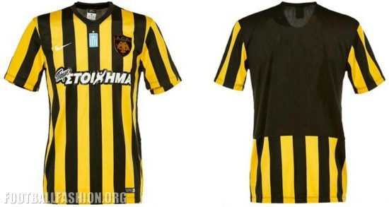 The AEK FC 2016/17 away jersey uses their familiar yellow and black vertical stripes on a v-neck Nike kit template. A block of black on the back of the shirt provides an area for player names and numbers.