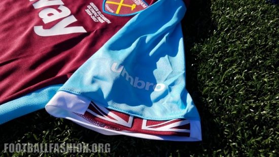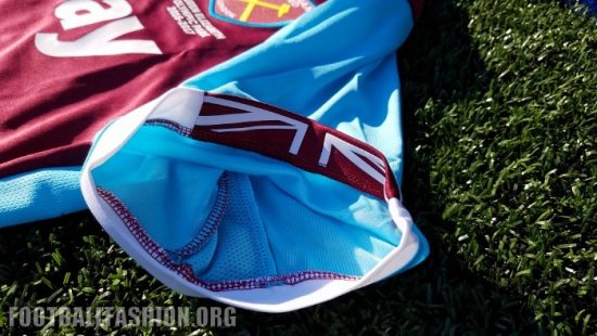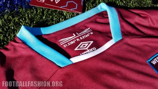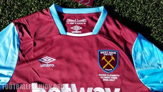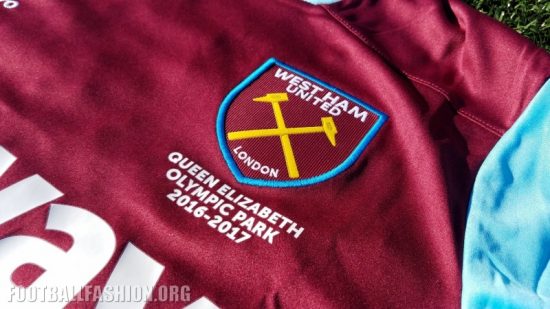 West Ham’s 2016/17 Umbro home kit is the first to feature the Hammers’ new look badge that sees the Boleyn Castle removed and the word “London” added towards it bottom. The text “Queen Elizabeth Olympic Park 2016-2017” is printed below the crest in celebration of the team’s new home ground – the third largest in the Premier League. The geographical co-ordinates of the stadium are printed below a stylized Union Jack on the inside neckline.