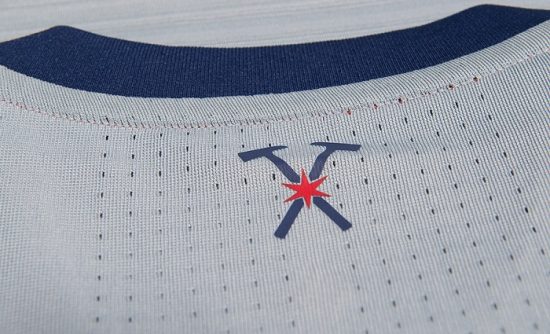 The Chicago Fire 2017 adidas away kit includes several details related to the team and its city. These include the year of the Fire’s founding, 1997, printed in red on its jocktag, cross fireman’s axes on its outside upper back, and the six pointed stars of the City of Chicago’s flag on its sleeve trip. The stars also appear on the socks that accompany the jersey.
