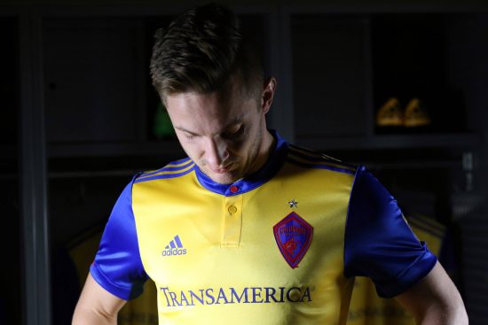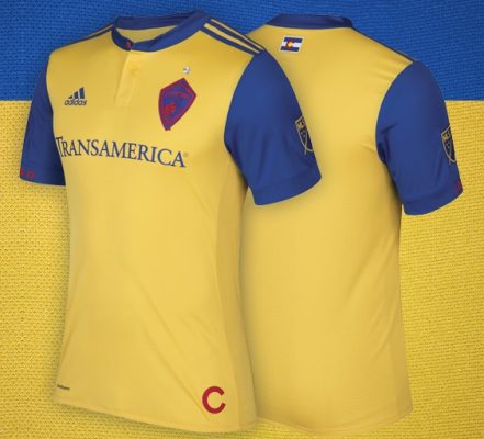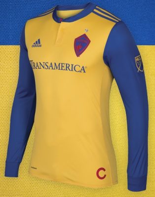 The shirt uses a clever new adidas design featuring a modern henley collar with a single red button. Its body is gold while its sleeves, collar and adidas shoulder stripes are in what the Rapids call “power blue”.