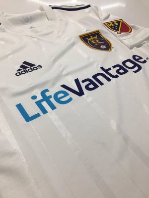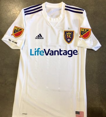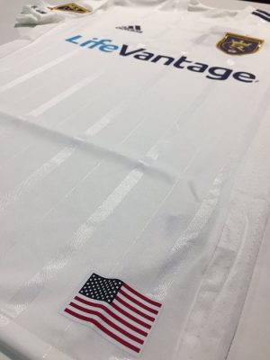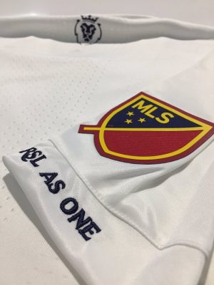 An American flag is printed in the jocktag area of the kit while a silver star sits atop the RSL crest in recognition of the team’s 2009 MLS Cup title. “RSL AS ONE” is embroidered on the right sleeve of the short sleeved version of the Real Salt Lake’s new secondary jersey.
