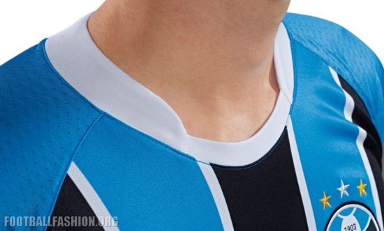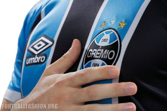 In the famous sky blue and black stripes of the “Tricolor”, the new Gremio primary shirt was unveiled along with a light blue 2017 away jersey from Umbro Brasil. Both kits use a new bespoke design from the Brazilian subsidiary of the Manchester, UK-based football equipment specialists featuring a rounded collar with a low rise effect on its rear two thirds.