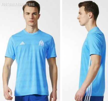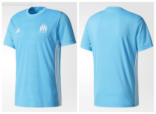 The Olympique de Marseille 2017/18 adidas away kit is a sky blue affair with a modern rounded neckline. Subtle ventilated hoops run along its front while white adidas stripes adorn is sides.
