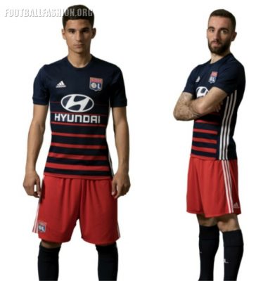 Olympique Lyon’s 17/18 away kit is a crewneck, dark blue affair with a series of red horizontal lines running from its mid-chest to waist line. The width of the stripes increase towards the hem. The stripes are meant to recall the city of Lyon’s annual Festival of Lights (Fête des lumières).