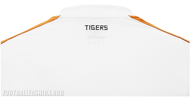 According to The Tigers: The (17/18 kit’s) design is a modern take on the traditional Club style, with predominately white jersey with impactful bold amber matt shine running diamonds on the sleeve and on the reverse of the shirt there is a stylised ‘TIGERS’ wording sign off.