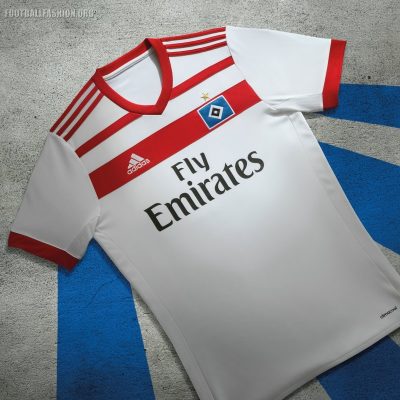 The front of the white kit is highlighted two red stripes along the chest taken from the 82/83 home shirt. longitudinal strip on the chest. The HSV motto of “Nur der HSV” (Only the HSV) is printed on the outside upper back of the jersey. The kit is matched with red shorts and blue socks.