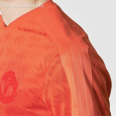 The Manchester United 2017/18 adidas Originals kit gas vivid red-on-red pattern inspired by an Aztec design. Subtle piping with a tonal effect decorates the shoulders, while the Manchester United team crest, their sponsor’s brand name, and a Trefoil logo are all up front and red to match.