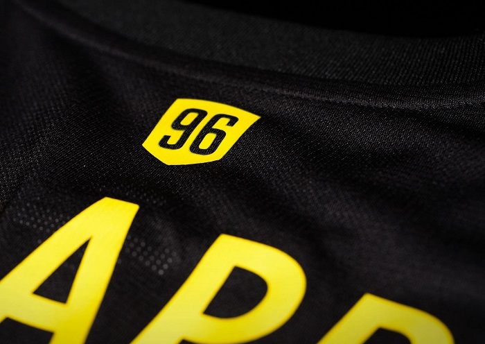 The 2018 Black Kit features a one-button collar, embossed checkerboard fabric and three dark-on-dark stripes along the kit’s sides. The black is offset by an all-gold Crew SC badge on the front as well as gold-colored names and numbers on the back.