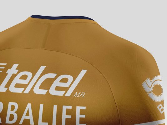 The Pumas UNAM 2018 Nike third shirt also features the club’s primary navy blue via collar trim, side striping and sleeve bands. The bands are reminiscent of those found on American football jerseys. A large print of a puma head appears on the front of the shirt in Pumas UNAM tradition.