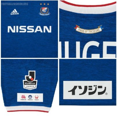 The Yokohama F. Marinos 2018 home kit feautures the team’s customary blue base with red and white accenting at its collar and sleeves.
