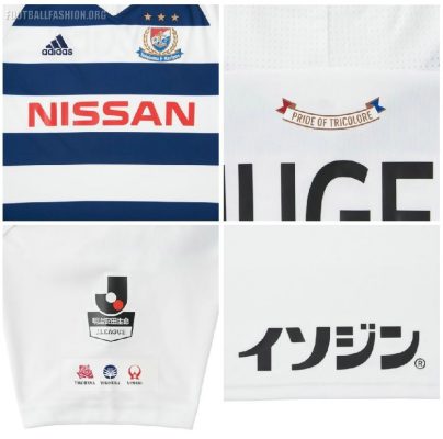 Yokohama F. Marinos’ 2018 away kit is based on the same adidas template as their new primary shirt. It has a white base with a series of dark blue horizontal stripes on its front inspired by Yokohama’s maritime history.