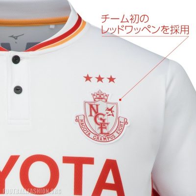 Nagoya Grampus’ 2018 Mizuno away kit has a white base with red and orange accenting at its collar, sleeve cuffs and sides. A series of stripes that fade from red to white start at the waistline. Three stars appear above the team badge in recognition of their league and Emperor’s Cup titles. The jersey is matched with red shorts and socks.