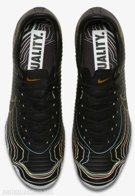 The logo of Nike’s EQUALITY campaign to support inclusion for everyone by providing a platform for all athletes to celebrate and participate in this movement appears is printed on the insole of the boot.