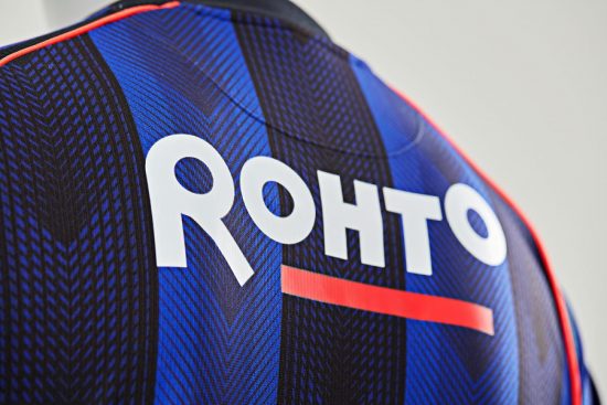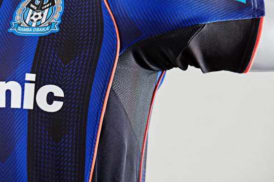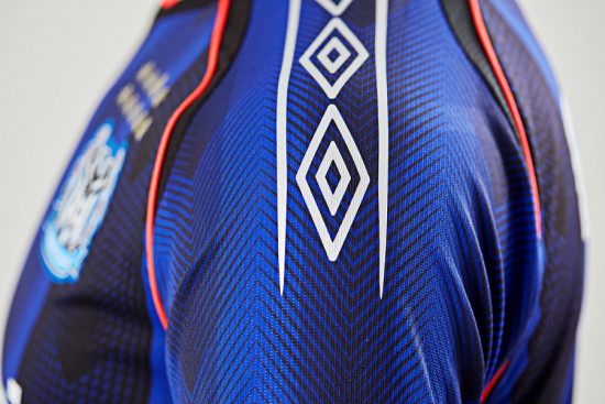 The Gamba Osaka 2018 Umbro home kit features vertical stripes in two shades of blue. They include a “Kasurasu” (traditional Japanese pattern) native to the Kansai region since ancient times. “Heat Red” piping provides further detailing as an expression of Gamba Osaka’s “fighting spirit” with club pride.