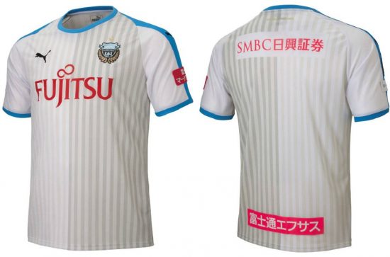 The Kawasaki Frontale 2018 AFC Champions League home and away kits also use the PUMA crewneck template on feature for the domestic shirts. The home jersey has a light blue base with a block of black on the upper front and sleeves. The alternate kit is white sky blue horizontal pinstripes, Formstripes and collar details.