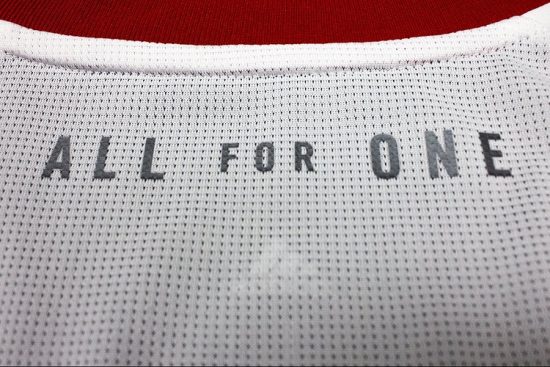 Toronto FC’s 2018 away jersey maintains the team’s custom of usually donning white secondary shirts. It uses a new v-neck design from adidas with a red collar and black sleeve cuffs. TFC’s motto of “ALL FOR ONE” is printed on the kit’s signoff area.