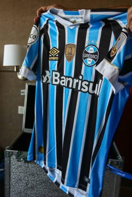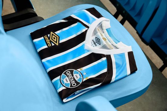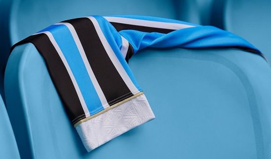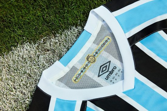 Provided by longtime cub technical partner Umbro Brasil, the Grêmio 2018 home jersey uses a bespoke v-neck design in the unmistakable sky blue, black and white stripes of the two-time Campeonato Brasileiro Série A champions.