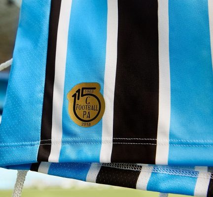 Grêmio’s 115th Anniversary is celebrated with a print that shows the evolution of their crest through the years on the inside neck area of the shirt. A retro-styled anniversary graphic appears at the middle of the print and on the kit’s lower front right.