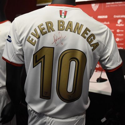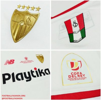 The Sevilla badge on the kit is all gold and matches with the player names and numbers on the back. The contestants, date and venue of the 2018 Copa del Rey Final are printed in red in between the New Balance logo and club crest on the jersey’s chest.