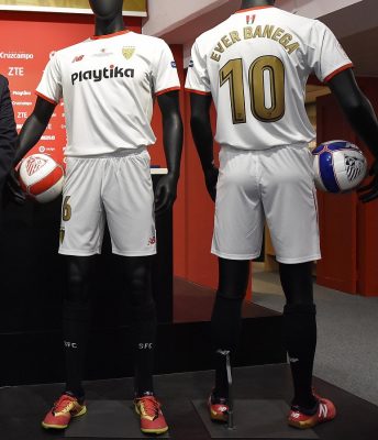 A shield that combines Sevilla FC’s red and white with the Andalusian flag is embroidered on the upper outside back of the Spanish La Liga club’s latest kit.